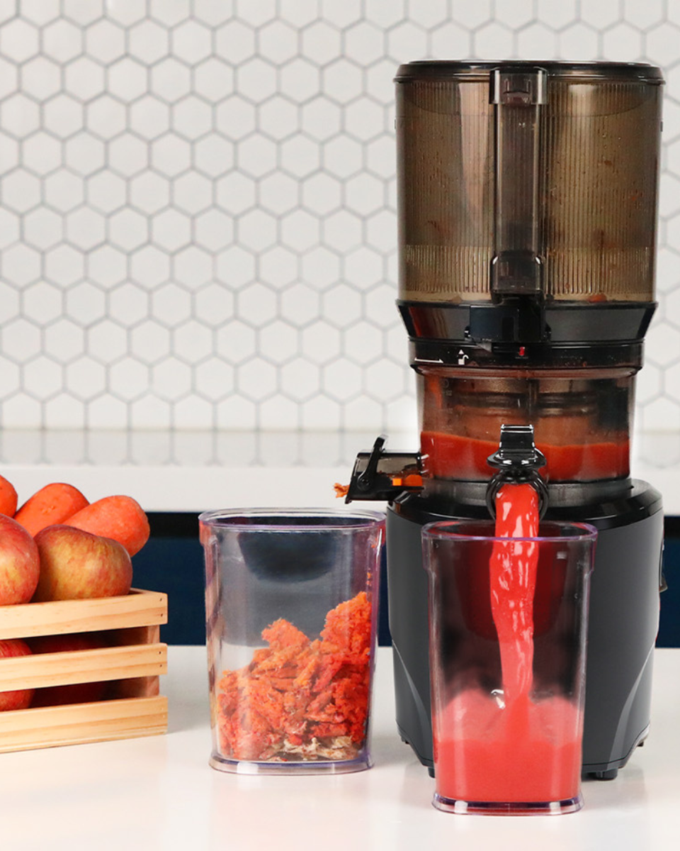 "El exprimidor lento Kuvings B6000 obtiene más beneficios de las frutas y verduras enteras triturándolas y presionándolas."