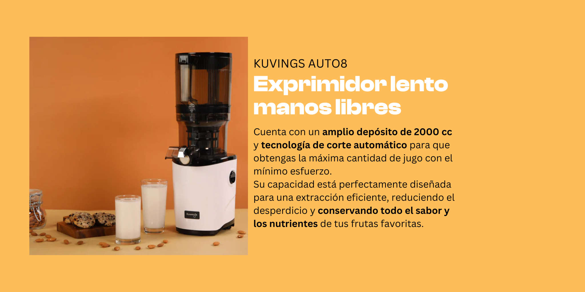 Kuvings AUTO8 se encarga de todo. Su diseño inteligente y automático te permite disfrutar jugo natural todos los días sin ensuciar ni complicarte la vida.