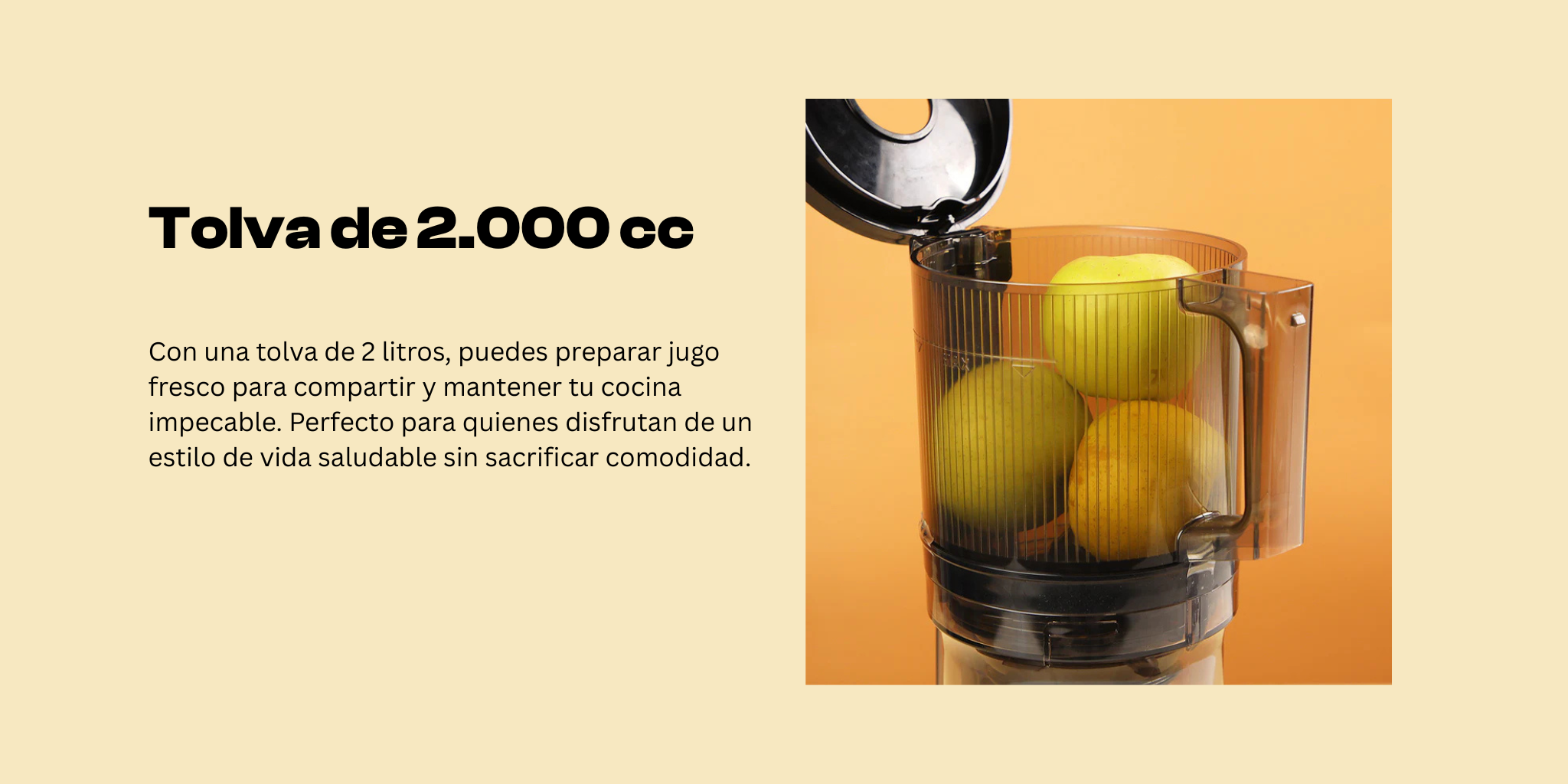 Equipada con un amplio depósito de 2000 cc y tecnología de corte automático, este extractor te ayuda a obtener la máxima cantidad de jugo con el mínimo esfuerzo. Su diseño optimiza la extracción, reduce el desperdicio y conserva todo el sabor y nutrientes de tus frutas y verduras.