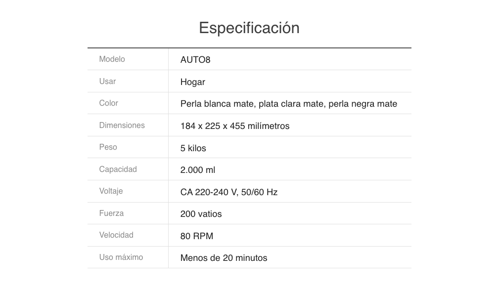 Pensado para quienes disfrutan preparar jugos de manera práctica y versátil, el AUTO8 ofrece una amplia capacidad de 2000 cc sin perder potencia ni rendimiento. Este extractor de jugos de tamaño mediano es perfecto si quieres disfrutar bebidas frescas y llenas de sabor todos los días, sin ocupar el espacio de los modelos más grandes.