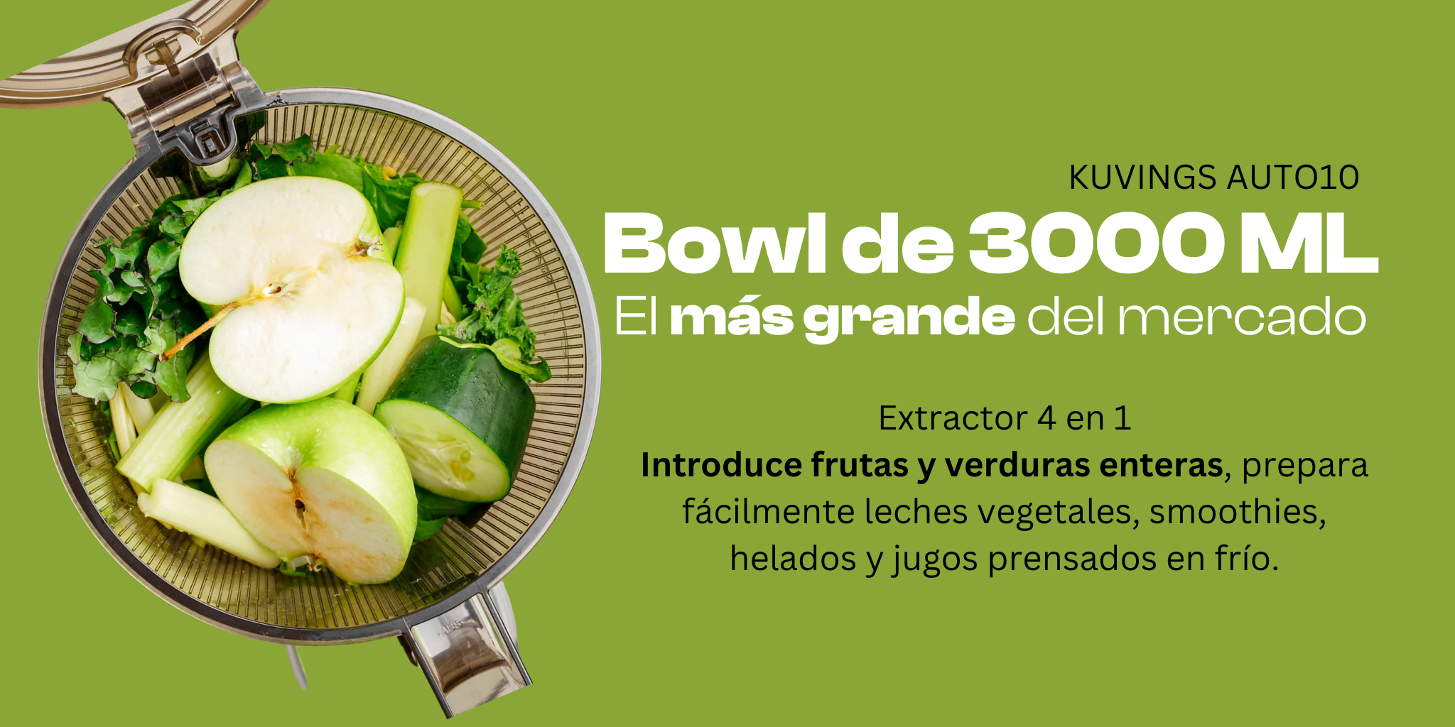 - Bowl Mega Whopper de gran capacidad: el Extractor de Jugo AUTO10 incorpora un bowl extra grande que te permite añadir más frutas y verduras al mismo tiempo, ideal para preparar jugos de prensado en frío para toda la familia.